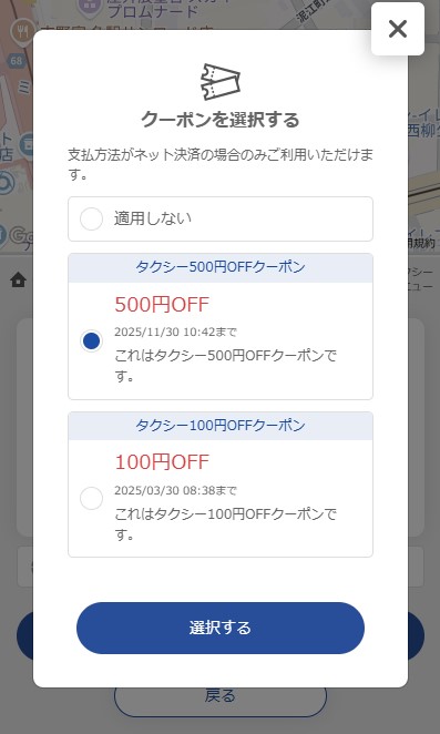一回の配車依頼につき、一つのクーポンが選択可能です。
