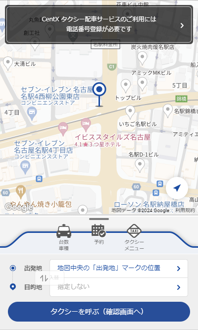 「CentXタクシー配車サービスのご利用には電話番号登録が必要です」ボタンをタップして利用開始画面を開いてください。