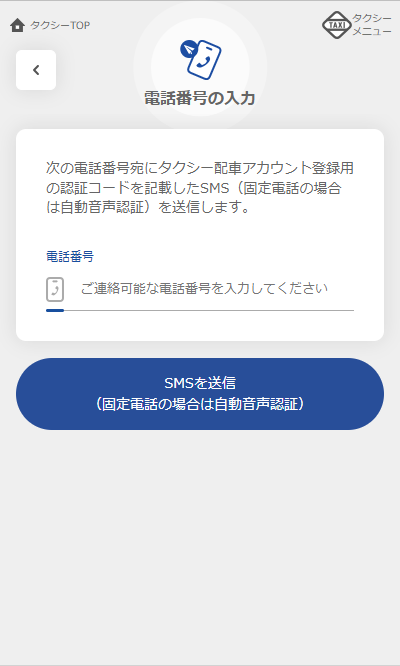 タクシー配車時にご連絡可能なスマートフォンの電話番号を入力し、「SMSを送信」ボタンをタップしてください。