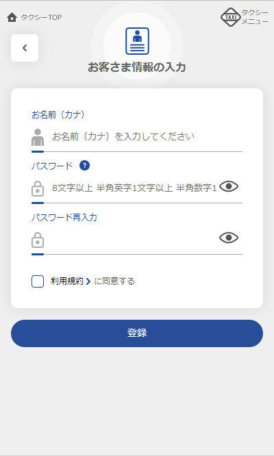 お名前(カナ)、パスワードを入力してください。利用規約をご確認いただき、同意いただける場合は利用規約に同意するにチェックを入れ、「登録」ボタンをタップしてください。